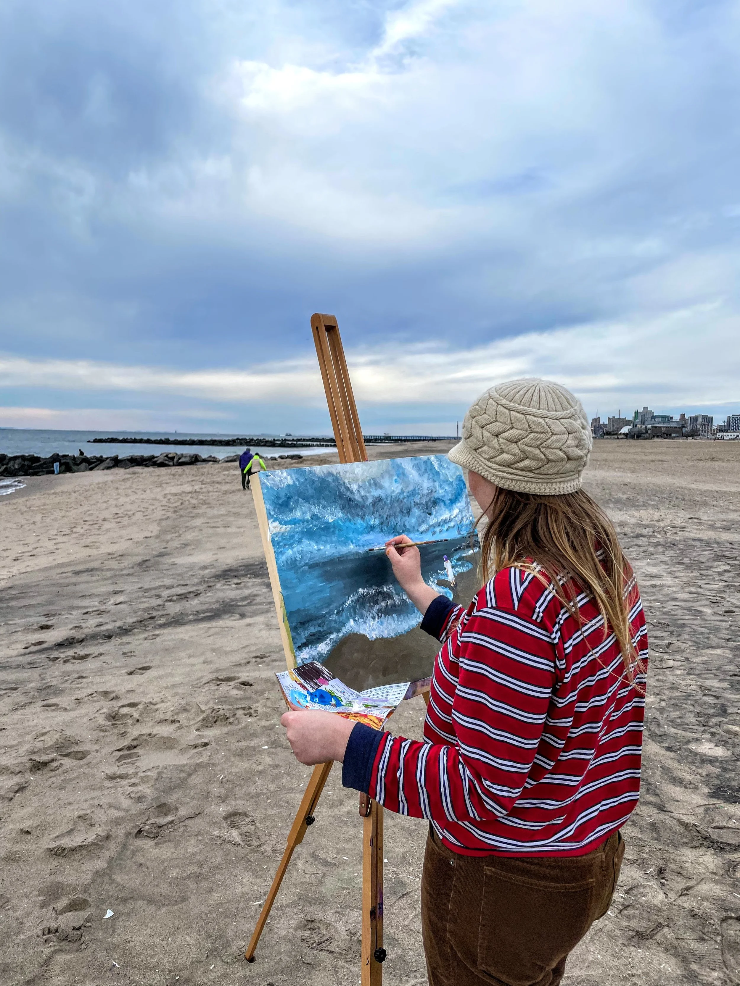 There was a recurring sequence of Domini that saw the protagonist waking up in bed. To achieve this shot in the limited space, I tied and sewed the bedding and the actor onto an upright mattress (bottom left) Another fun task for Domini was the painting of the canvas on the final beach scene. This painting was meant to match an important previous shot. I’m a bit fixated on the details, so you can see me (bottom right) making some last minute adjustments to the clouds in order for the painting to match.